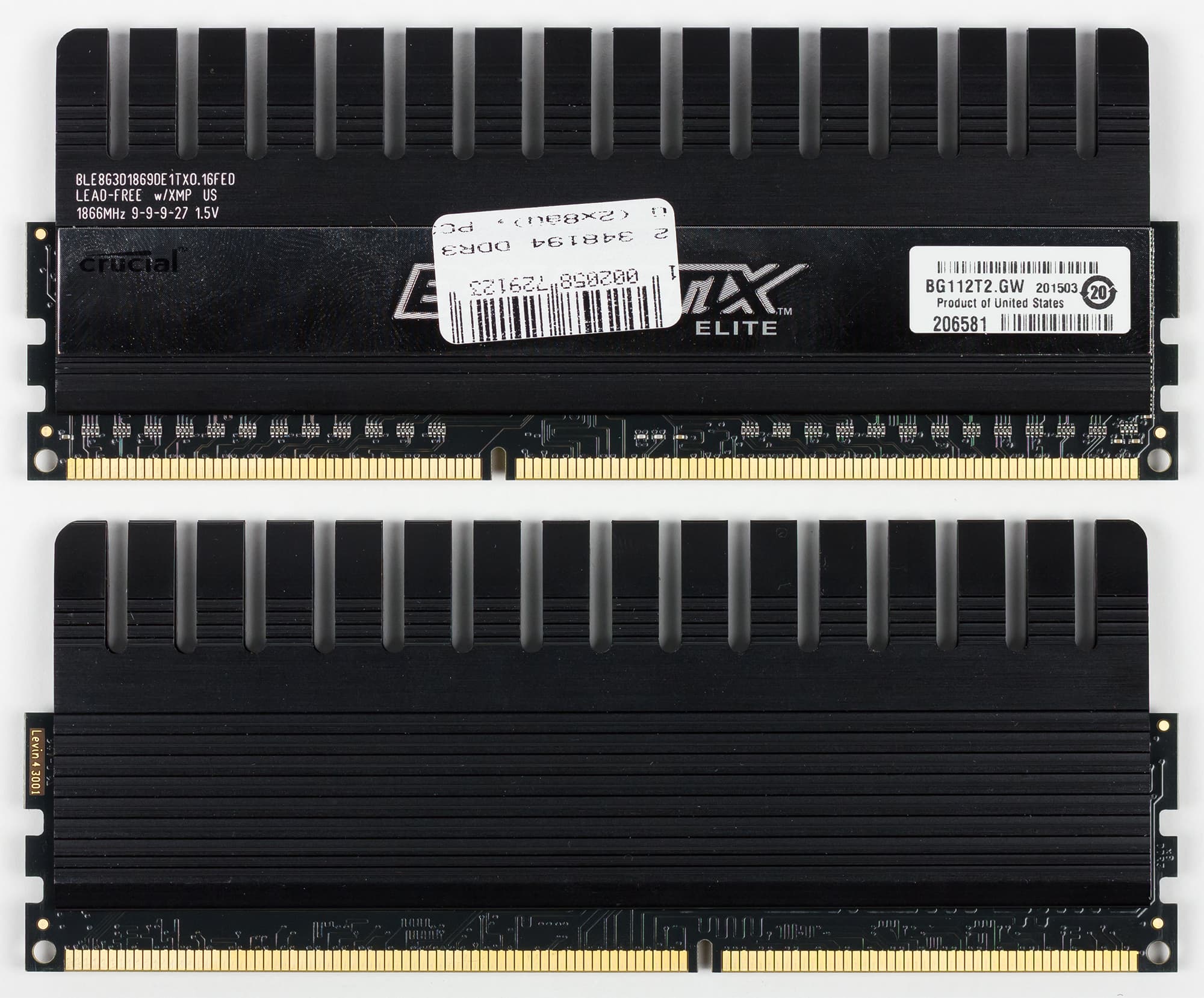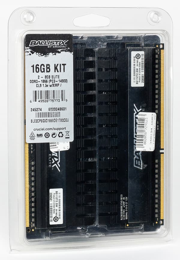 Память Crucial Ballistix Elite 16 GB DDR3-1866 представляет собой набор из двух модулей с суммарным объемом 16 ГБ. Эти модули памяти имеют маркировку BLE2KIT8G3D1869DE1TX0. Как именно расшифровывается данная маркировка, на сайте производителя не указывается, но можно предположить, что BLE — это обозначение серии Ballistix Elite, 2KIT8G означает комплект из двух модулей по 8 ГБ, 3D, по всей видимости, обозначает, что это память DDR3, а 18 — это, скорее всего, частота 1866 МГц. Что означают остальные цифры и буквы, не очень понятно.