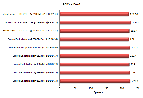 Приложение ACDSee Pro 8 также оказалось малотребовательным к скорости работы памяти. Здесь разница между лучшим и худшим результатами составляет всего 3,3%.