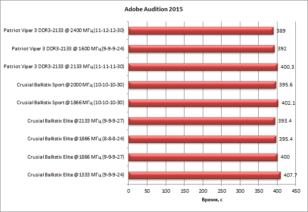 Тест на основе приложения Adobe Audition 2015, как и большинство других тестов, демонстрирует слабую зависимость от скорости работы памяти. Здесь разница между лучшим и худшим результатами составляет всего 4,8%.