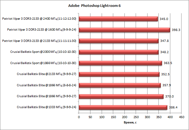 Приложение Adobe Photoshop Lightroom 6 также чувствительно к скорости работы памяти. В нашем тесте разница между худшим и лучшим результатами составила 15,4%.