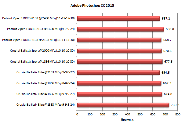 Приложение Adobe Photoshop CC 2015 оказалось довольно чувствительным к скорости работы памяти. В нашем тесте разница между худшим и лучшим результатами составила уже 13%.