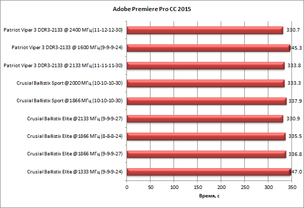 Как выяснилось в ходе тестирования, приложение Adobe Premier Pro CC 2015 немного более «чувствительно» к скорости работы памяти в сравнении с предыдущим тестом. Здесь разница между худшим (347 с) и лучшим (331 с) результатами составляет уже 4,7%.