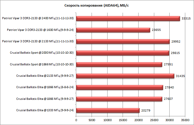 Далее приведены результаты тестов комплекта модулей памяти Patriot Viper 3 DDR3-2133 в режимах DDR3-1600 (9-9-9-24, режим по умолчанию), DDR3-2133 (11-11-11-30, режим XMP-профиля) и DDR3-2400 (11-12-12-30, режим разгона по частоте).