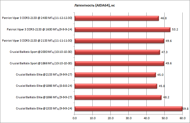 Далее приведены результаты тестов комплекта модулей памяти Crucial Ballistix Elite 16 GB DDR3-1866 в режимах DDR3-1333 (9-9-9-24, режим по умолчанию), DDR3-1866 (9-9-9-27, режим XMP-профиля), DDR3-2133 (9-9-9-27) и DDR3-1866 (8-8-8-24).