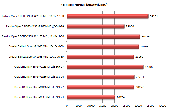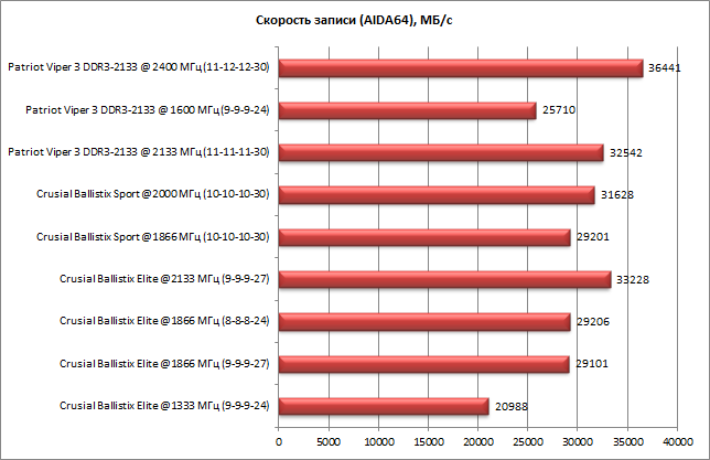 Анализируя результаты тестирования, нужно учесть, что мы сравнивали лучший и худший результаты. При этом худший результат демонстрировал режим памяти DDR3-1333 c таймингами 9-9-9-24 (память Crucial Ballistix Elite в режиме по умолчанию), а лучший результат в большинстве случаев — режим DDR3-2400 c таймингами 11-12-12-30 (режим разгона по частоте памяти Patriot Viper 3). Но такой разгон памяти был получен конкретно для нашего комплекта, и возможно, с другим комплектом результаты разгона были бы другие (тут уж как повезет). Поэтому более корректно ориентироваться на результаты работы памяти в режиме XMP-профиля. Напомним, что для памяти Crucial Ballistix Elite это режим DDR3-1866 с таймингами 9-9-9-27, для памяти Crucial Ballistix Sport — DDR3-1866 с таймингами 10-10-10-30, а для памяти Patriot Viper 3 DDR3-2133 — DDR3-2133 с таймингами 11-11-11-30. И если сравнивать именно эти режимы работы, то выяснится, что разницы между ними практически нет.