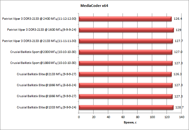 По результатам нашего тестирования с использованием приложения MediaCoder x64 x64 0.8.36.5757 данная задача практически не чувствительна к быстродействию памяти. Худший результат (128,7 с для памяти в режиме DDR3-1333 МГц с таймингами 9-9-9-24) отличается от лучшего (126,3 с для памяти в режиме DDR3-2133 МГц с таймингами 9-9-9-27) всего на 2,4 с (1,9%).
