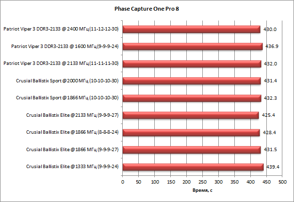 В ходе тестирования выяснилось, что приложение Phase Capture One Pro 8 совсем не требовательно к пропускной способности памяти. В нашем тесте разница между худшим и лучшим результатами составила всего 3,3%.