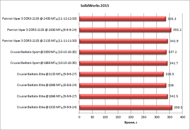 Тест на основе приложения Dessault SolidWorks 2015 SP3 с дополнительным пакетом Flow Simulation демонстрирует неплохую зависимость от скорости работы памяти. В этих расчетах лучший результат отличается от худшего на 10%.