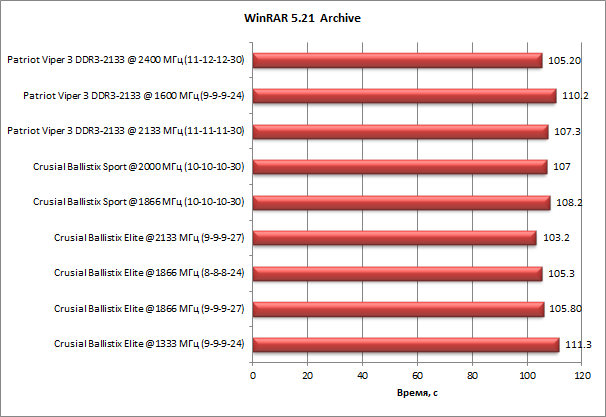 Приложение WinRAR 5.21 оказалось более требовательно к скорости работы памяти. Точнее, речь идет именно о процессе архивировании данных, поскольку процесс разархивирования вообще никак не зависит от памяти (мы даже не приводим диаграмму результатов, поскольку они абсолютно одинаковы для всех режимов работы памяти). В нашем тесте лучшее время архивирования отличается от худшего на 7,8%
