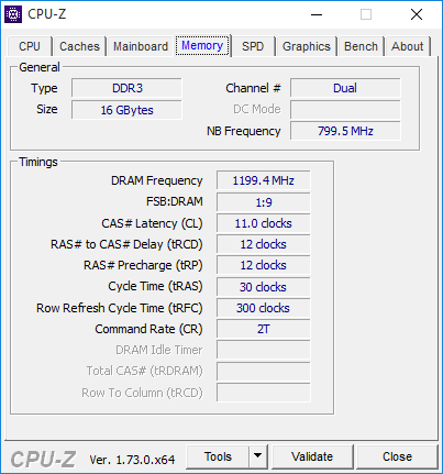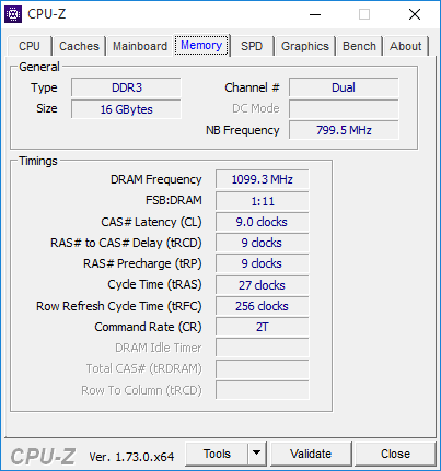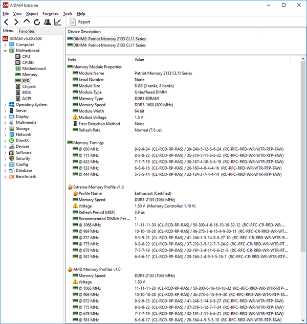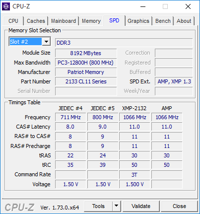 Согласно спецификации, эти модули поддерживают работу на частоте 2133 МГц при напряжении питания 1,5 В и таймингах 11-11-11-30. Заявленные характеристики реализуются через XMP-профиль, а настройки по умолчанию, прописанные в SPD, следующие: DDR3-1600 с таймингами 9-9-9-24.