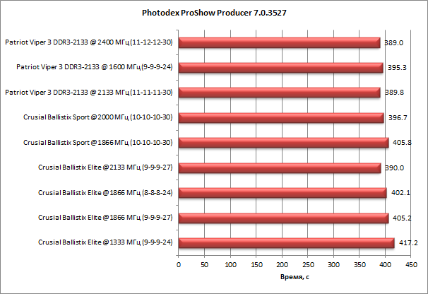 Как выяснилось в ходе тестирования, приложение Photodex ProShow Producer 7.0.3527 немного более чувствительно к скорости памяти, и в нашем тесте разница между худшим и лучшим результатами составляет 7,2%.