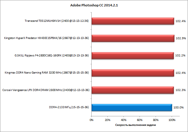 Теперь обратимся к результатам тестирования комплектов памяти в четырехканальном режиме. Результаты представлены на диаграммах, причем для каждого комплекта приведена безразмерная скорость выполнения задачи, выраженная в процентах. За 100% принимается скорость выполнения задачи в режиме DDR4-2133 с таймингами 15-15-15-36.