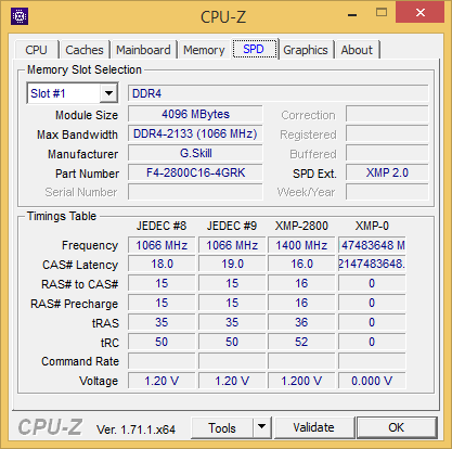 На нашем тестовом стенде с настройками UEFI BIOS по умолчанию память G.Skill Ripjaws F4-2800C16Q-16GRK завелась на частоте 2133 МГц с таймингами 15-15-15-35 и при напряжении питания 1,2 В.