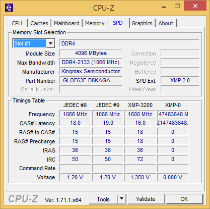 Как следует из названия, данная память должна поддерживать частоту 3200 МГц. Естественно, речь идет об XMP профиле. Вообще, вся память Kingmax DDR4 Nano Gaming RAM в оригинале — это DDR4-2133. А все заявленные высокие частоты этой памяти — это, конечно же, разгон через активацию XMP-профилей. И, как мы уже имели возможность убедиться на примере памяти Corsair, не факт, что если на коробке написано 3200 МГц, вы реально сможете заставить работать эту память на такой частоте.