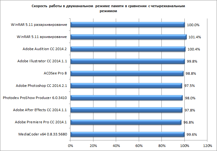 Результат тестирования для двухканального режима работы памяти представлен на диаграмме. За 100% принимается скорость выполнения задачи в четырехканальном режиме работы памяти.