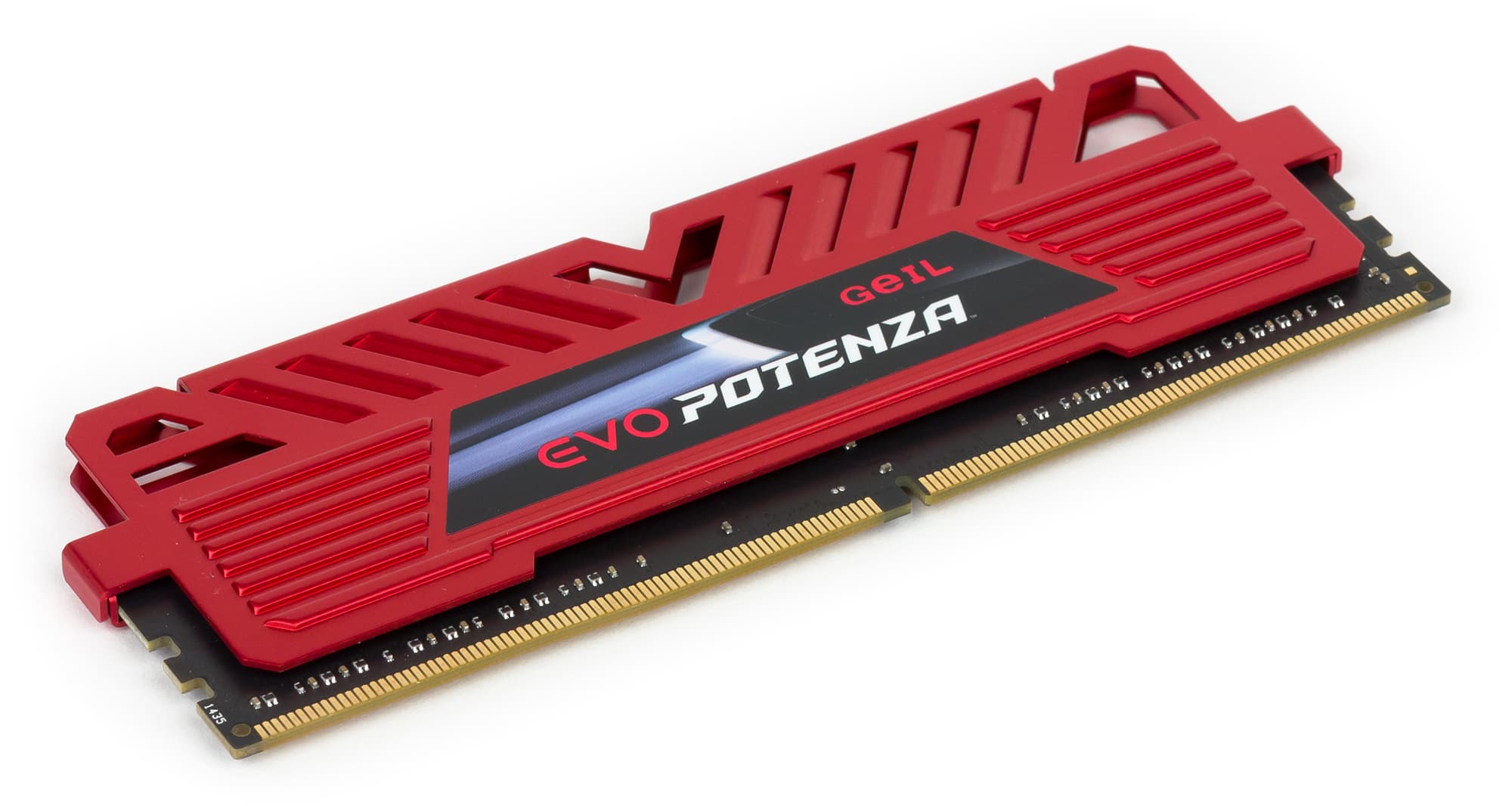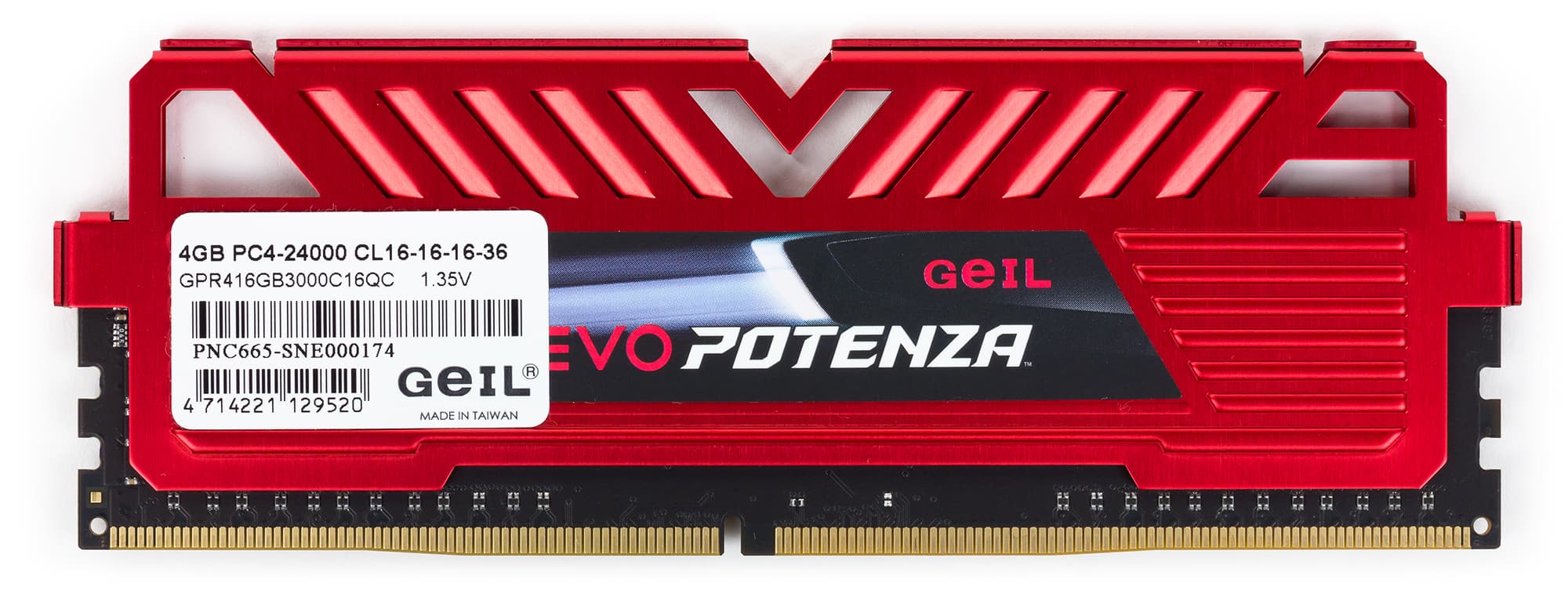 Комплект четырехканальной памяти Geil GPR416GB3000C16QC относится к серии Geil Evo Potenza. Это четыре модуля памяти DDR4-3000 суммарным объемом 16 ГБ (4 × 4 ГБ). Модули памяти оснащены радиаторами охлаждения бордового цвета. Сами модули памяти односторонние, то есть все чипы памяти расположены на них с одной. Вообще, нужно отметить, что радиаторы на памяти внушительно, скажем так, не выглядят. Толщина пластинок, из которых сделан радиатор, составляет менее 1 мм. Высота модуля памяти с радиатором — 47 мм.