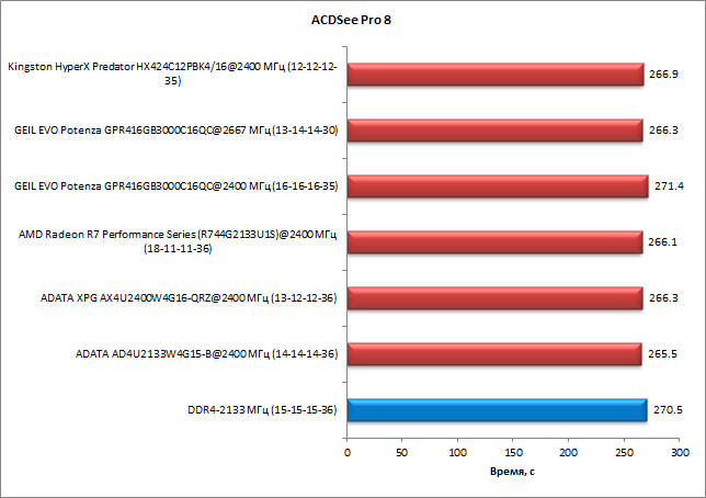 В тесте с использованием приложения ACDSee Pro 8 зависимость от скорости работы памяти совсем уж незначительная: разница между худшим и лучшим результатами составила порядка 1,5%. Память Geil Evo Potenza ничем приятным не удивила: на частоте 2667 МГц она работает примерно так же, как любая другая память DDR4-2400, а на частоте 2400 МГц результаты памяти Geil Evo Potenza даже немного хуже, чем результаты DDR4-2133.