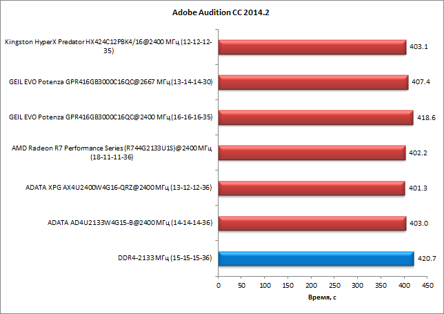 А вот в тесте с использованием приложения Adobe Audition CC 2014.2 зависимость от скорости работы памяти хоть и незначительная, но есть: разница между худшим и лучшим результатами составила 4,8%. Для памяти Geil Evo Potenza, как и в остальных случаях, получаем следующее: на частоте 2667 МГц она работает немного хуже, чем любая другая память DDR4-2400, а на частоте 2400 МГц результаты памяти Geil Evo Potenza примерно такие же, как результаты DDR4-2133.