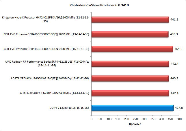 Приложение Photodex ProShow Producer 6.0.3410 немного более чувствительно к скорости памяти, и в нашем тесте разница между худшим и лучшим результатами составляет порядка 6%. Но опять-таки, самая «скоростная» память Geil Evo Potenza на частоте 2667 МГц работает так же, как любая другая память DDR4-2400, а на частоте 2400 МГц результаты памяти Geil Evo Potenza сопоставимы с результатами DDR4-2133.