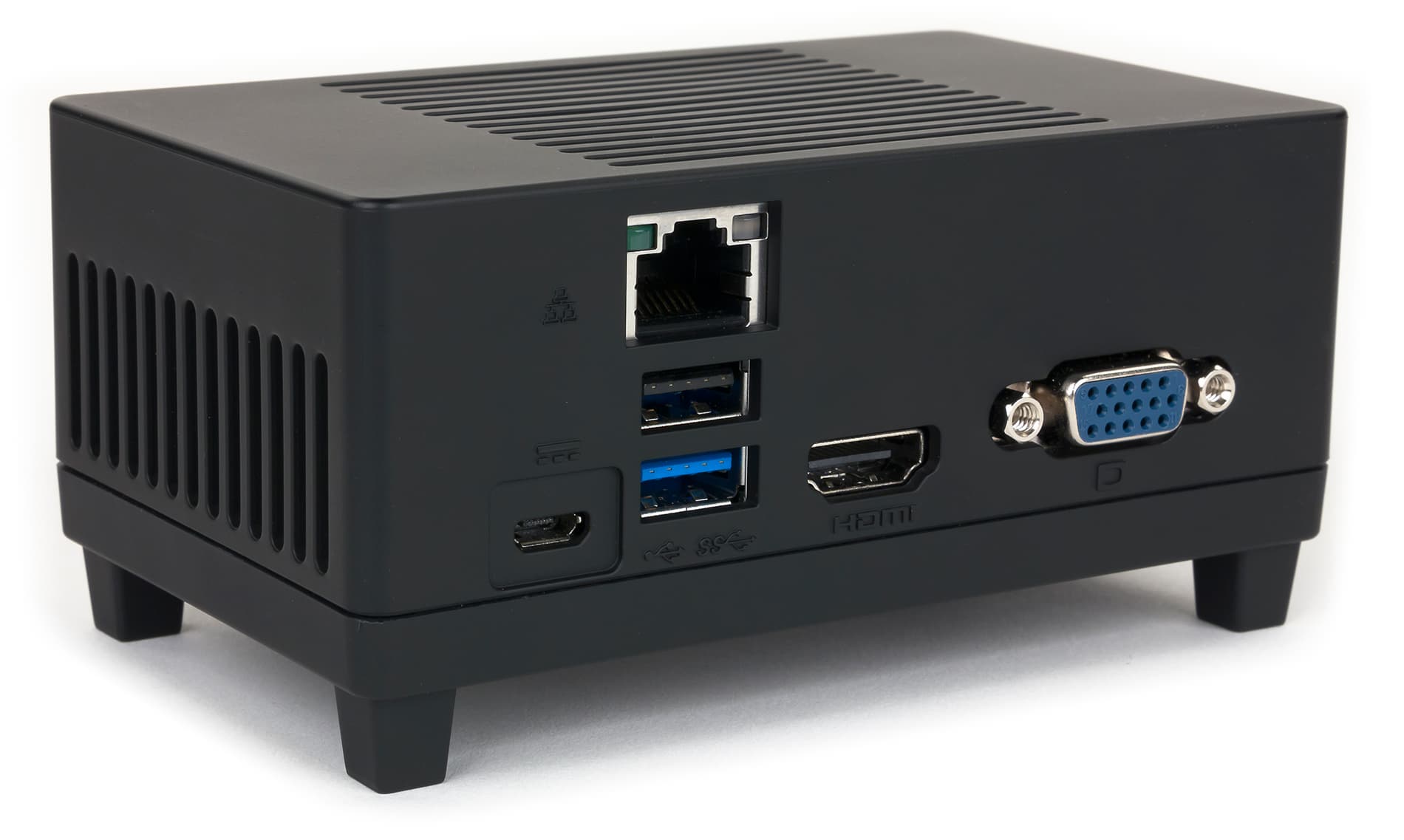 Кроме USB-портов на задней панели расположены также сетевой разъем RJ-45, разъемы VGA и HDMI, а также разъем Micro-USB для подключения адаптера питания.