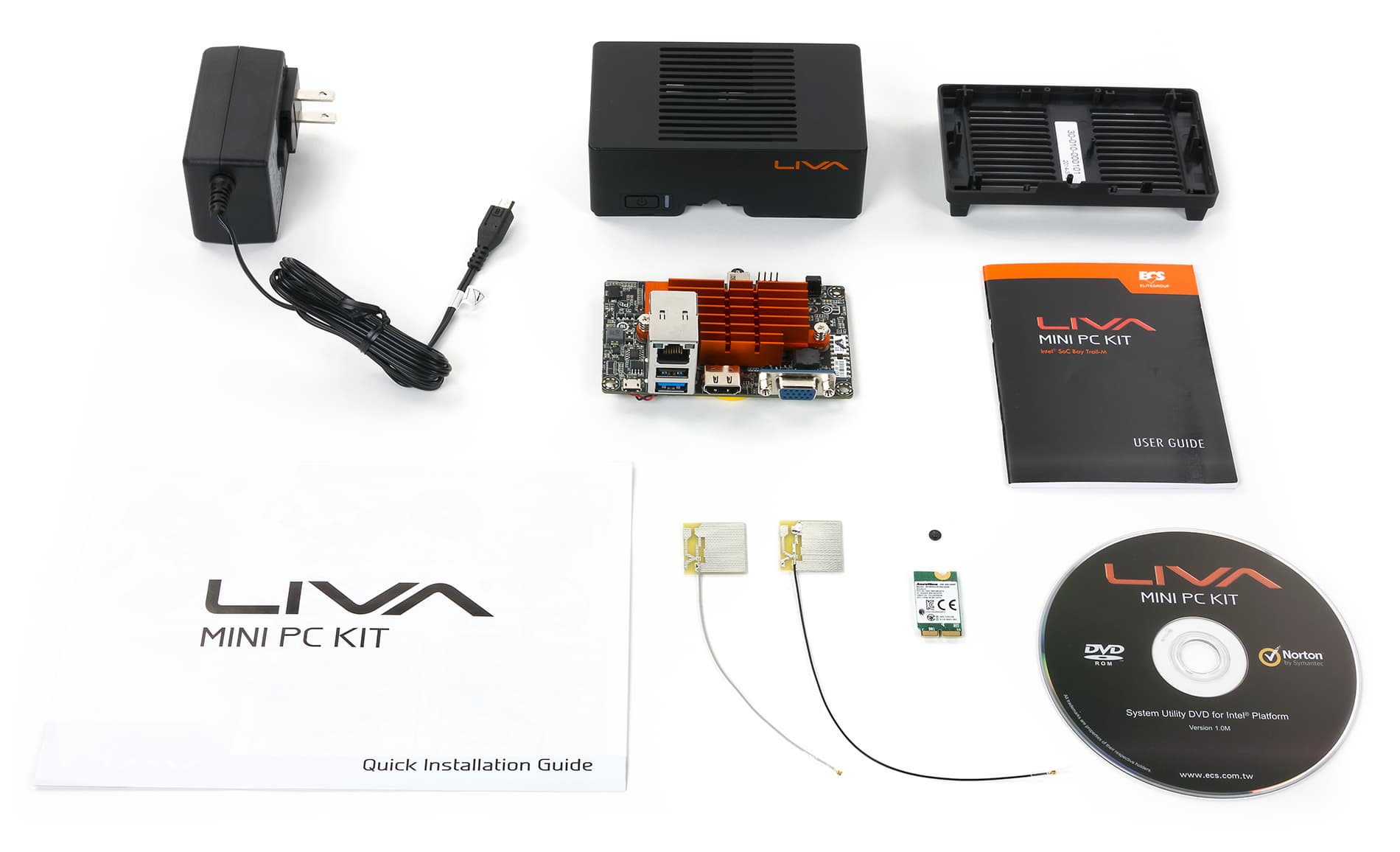 ECS Liva поставляется в небольшой коробке из очень прочного картона. В комплект поставки, кроме самого мини-ПК, входит адаптер питания, инструкция пользователя на английском языке, DVD-диск с драйверами, а также модуль Wi-Fi с двумя антеннами, который устанавливается в разъем M.2 на плате.
