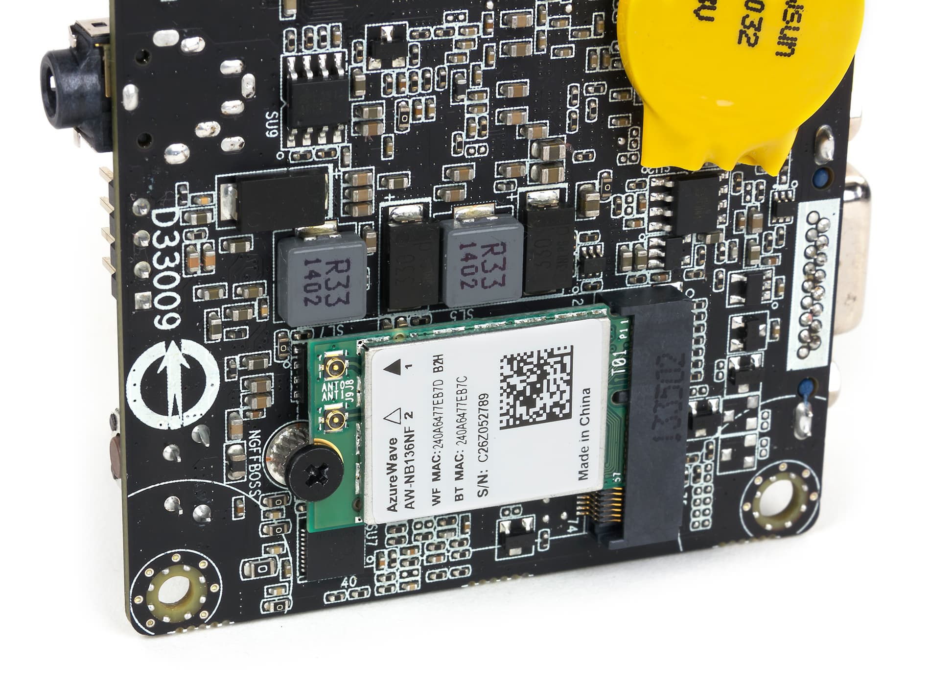 Что касается сетевого интерфейса, то для подключения к проводному сегменту локальной сети имеется гигабитный интерфейс на базе контроллера Realtek RTL8111G. Кроме того, в комплекте идет модуль беспроводной связи AzureWave AW-NB136NF. Это двухдиапазонный (2,4 и 5 ГГц) модуль с поддержкой стандартов Wi-Fi 802.11b/g/n/ac и Bluetooth 4.0. Данный модуль вставляется в разъем M.2 на плате мини-ПК, а к нему, в свою очередь, через миниатюрные разъемы U.FL подключаются две антенны. Нужно отметить, что качество антенн оставляет желать лучшего: антенный кабель очень тонкий и соединен с коннектором U.FL-F довольно непрочно. Вставить-то антенные коннекторы в разъемы модуля легко, но вот попытка отсоединить антенну от модуля иногда заканчивается плачевно: антенный кабель может попросту выскочить из коннектора U.FL-F, а вставить его обратно — это отнюдь не тривиальная задача. Одним словом, качество антенн разочаровывает.