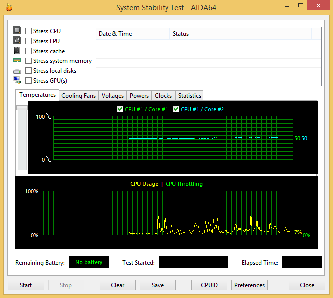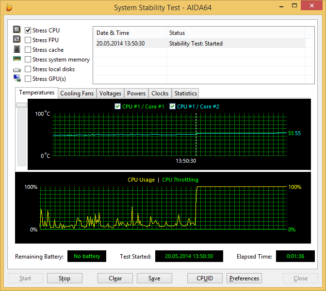 При загрузке процессора тестом Stress CPU (утилитой AIDA64 Extreme Edition — тест на стабильность системы), который использует целочисленные вычисления, частота процессора составляет 2,0 ГГц (коэффициент умножения x15). Температура процессора в этом режиме загрузки увеличивается до 55 °С.