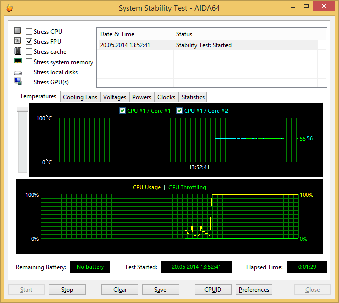 При загрузке процессора тестом Stress FPU, который использует вычисления c плавающей точкой, частота процессора также составляет 2,0 ГГц, а температура ядер не меняется и составляет все те же 55 °С.