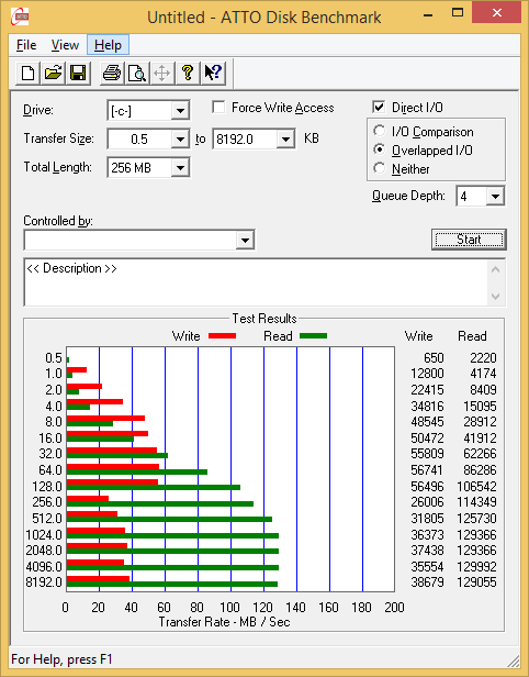 Утилита ATTO Disk Benchmark определяет максимальную скорость последовательного чтения на уровне почти 130 МБ/с, а записи — 55 МБ/с. По сегодняшним меркам это более чем скромные результаты.