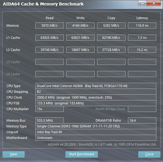 Согласно данным утилиты AIDA64 Cache & Memory Benchmark, скорость записи данных в память составляет 4169 МБ/с, а скорость чтения — 5870 МБ/с. Напомним, что для памяти DDR3-1066 в одноканальном режиме работы максимальная пропускная способность составляет 8533 МБ/с, так что приведенные результаты нельзя признать удовлетворительными.
