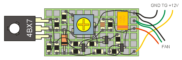 (например, как у Orb-ов) может вызвать проблемы. Хороший тепловой контакт с радиатором должен иметь только транзистор термодатчика. Поэтому если вся плата целиком не умещается на радиаторе, можно ограничится установкой на нем одного транзистора, который в этом случае подключают к плате с помощью проводов. Саму плату можно расположить в любом удобном месте. Закрепить транзистор на радиаторе несложно, можно даже просто вставить его между ребер, обеспечив тепловой контакт с помощью теплопроводящей пасты.