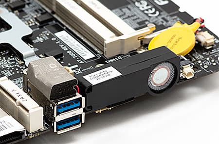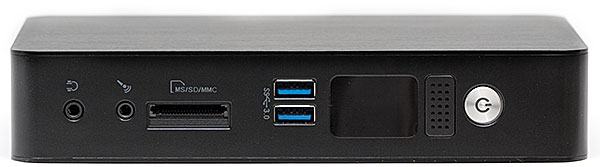 В частности, спереди удалось поместить два порта USB 3.0 (NUC всех модификаций и Gigabyte Brix обходятся всего одним, причем у части модификаций это лишь USB 2.0), встроенный картовод, выход на наушники и вход микрофона, т. е. полный набор того, что может пригодиться пользователю. Причем расположено оно именно на том месте, где может пригодиться — в недавно изученном нами мини-ПК Giada i53 расположение этих компонентов было, мягко говоря, куда менее удачным. Да и USB-порт один против двух — в этом плане линейка Foxconn выглядит куда более сбалансированно.