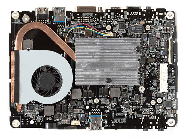 Бо́льшая же часть платы закрыта системой охлаждения процессора и чипсета, прячущихся под одним радиатором. Отметим, что расположение последних на обратной стороне системной платы является основной отличительной особенностью старших моделей серии АТ от nT, собственно и приводящей к необходимости использования более толстых корпусов. Зато при этом не приходится экономить на самой СО, которая стала более тихой — даже при серьезных нагрузках вентилятор вращается на невысоких оборотах, поскольку немалая часть тепла весьма эффективно рассеивается большим радиатором.