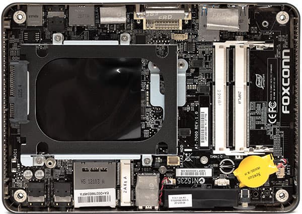 Чипсет во всех моделях одинаковый: мобильный Intel HM76 Express — точно такой же, как в Giada i53 и во многих мини-ПК других компаний. По формальным характеристикам он немного хуже применяемого в NUC QS77, однако для данной сферы применения более чем подходит. Тем более, что QS77 дороже, да и всеми его преимуществами воспользоваться бы все равно не удалось, поскольку ни один из устанавливаемых Foxconn процессоров (включая и i7-3517U) не поддерживает vPro.