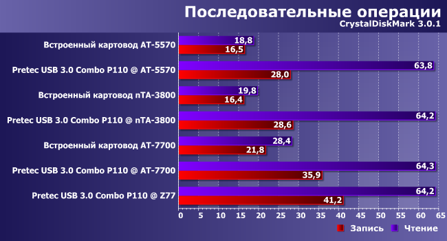 Что у нас еще осталось за кадром? Производительность встроенного картовода, поскольку разобраться с нынешними USB-контроллерами Realtek просто по названию не так-то легко (модификаций много, но нормальной документации нет), так что проще протестировать. Тем более, что за нами был еще «должок» по обзору AT-5570, где этот вопрос был вообще обойден вниманием. Поэтому мы провели небольшое экспресс-тестирование при помощи карты Kingmax SDXC Pro Class 10 64 ГБ и внешнего картовода Pretec USB 3.0 Combo P110. В число участников кроме АТ-7700 вошли еще упомянутый AT-5570, nT-A3800 (компактная модель компании на базе AMD E2-1800) и наша референсная тестовая система, обычно используемая для тестирования накопителей.