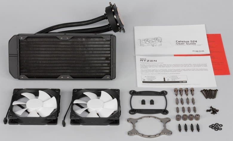 Внутри находятся радиатор с подключенной помпой, вентиляторы, комплект крепежа, два кабельных фиксатора с клейкими площадками и инструкция по установке.