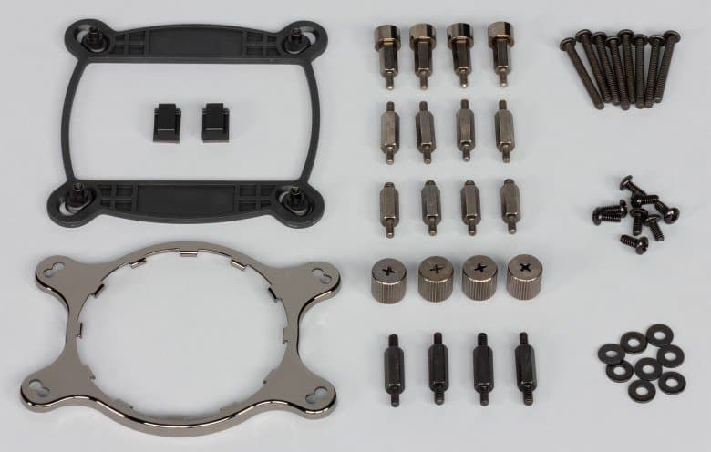 Крепеж изготовлен в основном из закаленной стали и имеет стойкое гальваническое покрытие. Рамка на обратную сторону системной платы изготовлена из пластика, впрочем, резьбовые отверстия в ее подвижных вставках по углам все равно в металлических втулках.