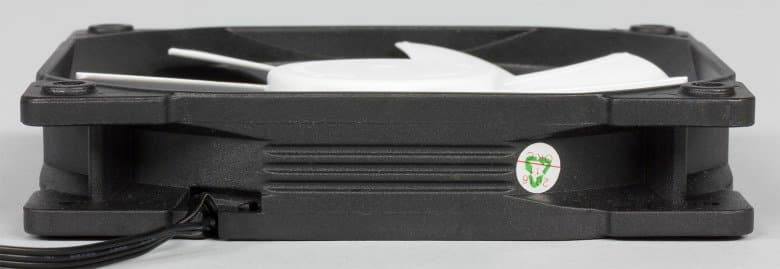 Высота вентилятора равна 25,5 мм по выступающим бортикам крепежных отверстий и 24,5 мм по рамке. Рамка имеет габариты 120 на 120 мм. Максимальная толщина радиатора с закрепленными вентиляторами составляет 59 мм.