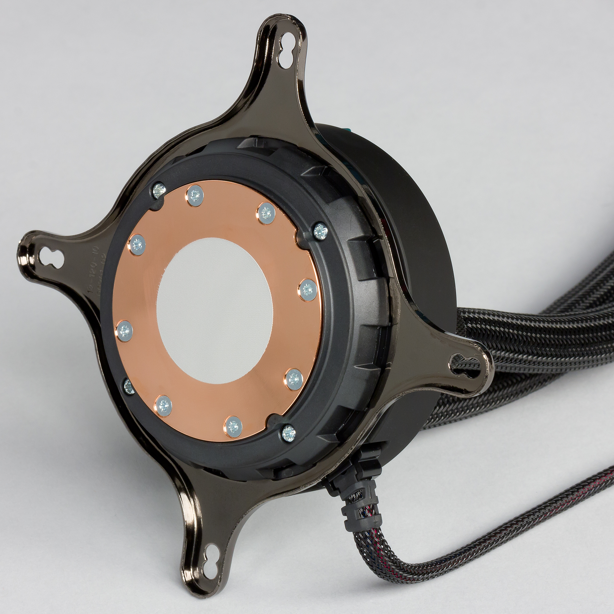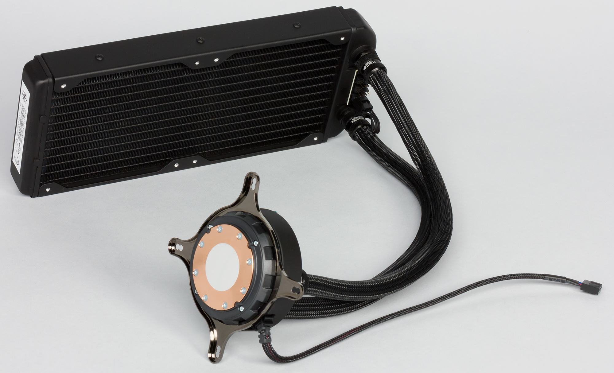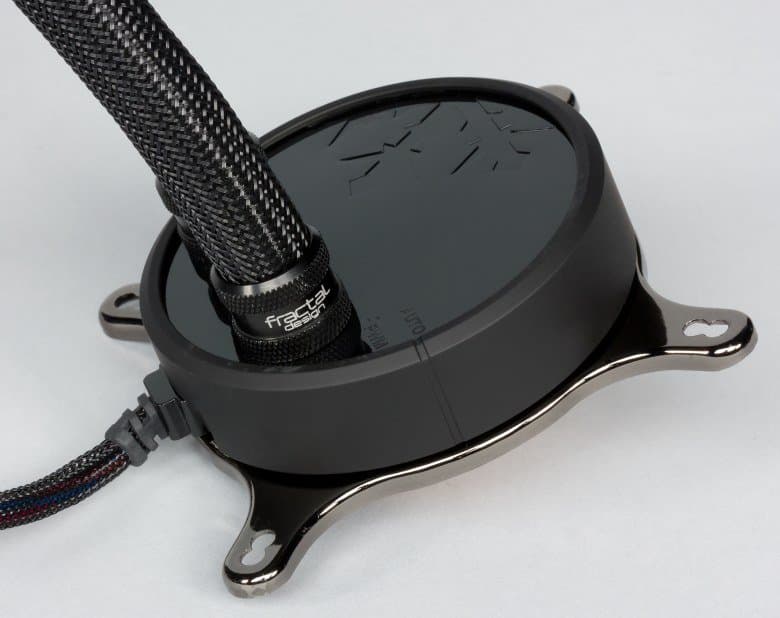 Система герметичная, заправлена, готова к использованию. Фитинги на радиаторе имеют стандартное резьбовое соединение G 1/4″, поэтому в принципе систему можно расширить, например, дополнив ее водоблоком для охлаждения видеокарты. Помпа интегрирована в один блок с теплосъемником. Подошвой теплосъемника, непосредственно прилегающей к крышке процессора, служит медная пластина. Ее внешняя поверхность имеет очень мелкую сглаженную концентрическую проточку, как будто она сточена на токарном станке и слегка отполирована. К центру поверхность выпуклая с перепадом порядка 0,2 мм.
