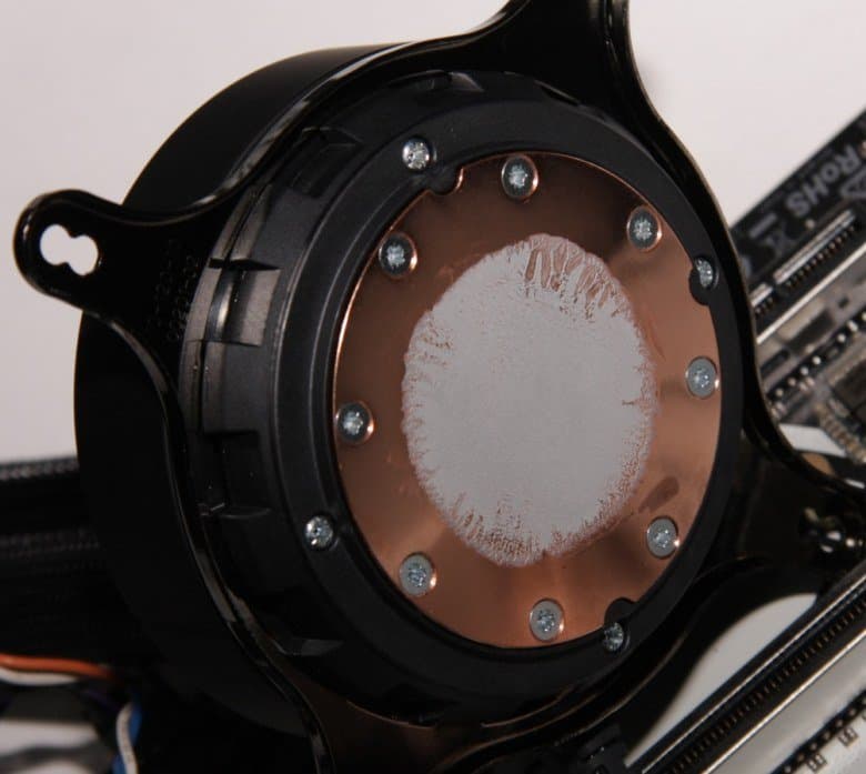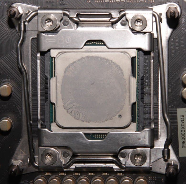 Диаметр этой пластины — 54 мм, а внутренняя часть, ограниченная отверстиями, имеет диаметр примерно 44 мм. Центральную часть медного основания занимает нанесенная тонким слоем термопаста. Запаса для ее восстановления в комплекте поставки, к сожалению, нет. Забегая вперед, продемонстрируем распределение термопасты после завершения всех тестов. На процессоре: