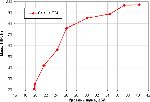 Приняв 25 дБА за критерий условной бесшумности, получим примерную максимальную мощность процессоров, соответствующих этому уровню: порядка 160 Вт. Гипотетически, если не обращать внимания на уровень шума, пределы мощности можно увеличить еще где-то на 30 Вт.