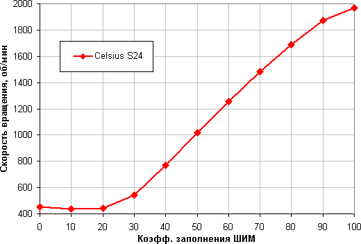 Отличный результат — плавный рост скорости вращения при изменении коэффициента заполнения от 20% до 100%. Отметим, что при КЗ 0% вентиляторы не останавливаются, поэтому в гибридной системе охлаждения с пассивным режимом на минимальной нагрузке такие вентиляторы придется останавливать, снижая напряжение питания.