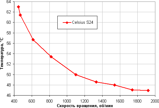 В этом тесте наш процессор с TDP 140 Вт не перегревается даже на минимальных оборотах вентиляторов в случае штатного способа регулировки с помощью только ШИМ. Отметим, что скорость снижения температуры с ростом скорости вращения вентиляторов начинает замедляться, и где-то после 1700 об/мин снижение температуры маскируется погрешностью измерений этого параметра. В автоматическом режиме работы данной системы охлаждения температура процессора в этом тесте достигла 57,6 градуса. Сопоставив это значение с графиком выше, можно сделать вывод о том, что в автоматическом режиме предпочтение отдается низкому уровню шума, а не низкой температуре ЦП.