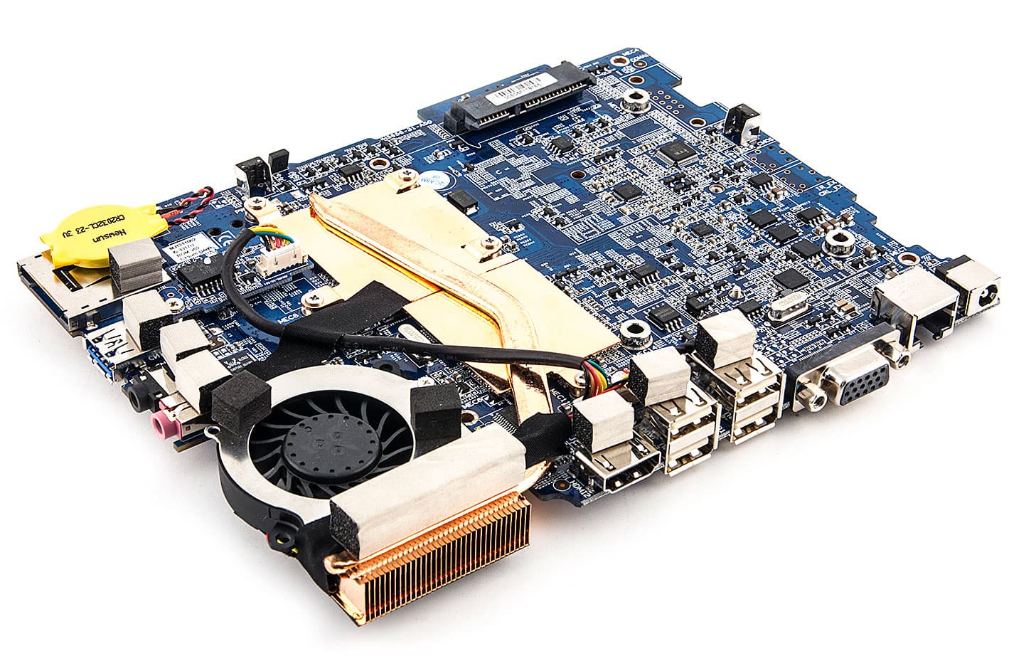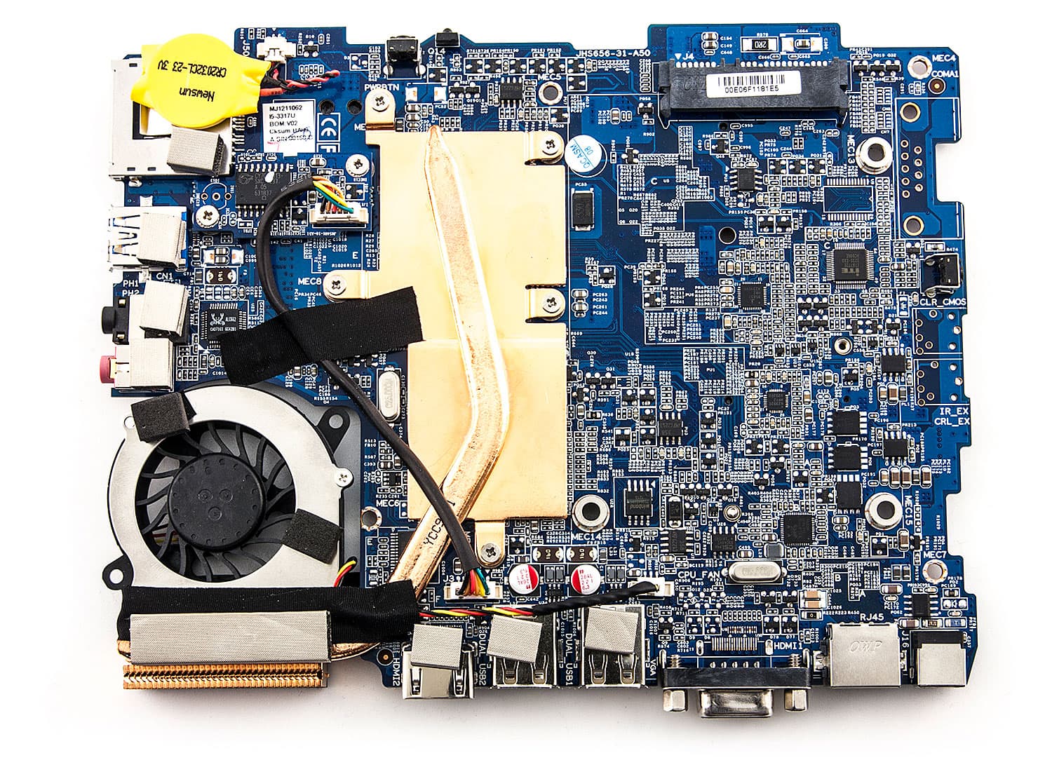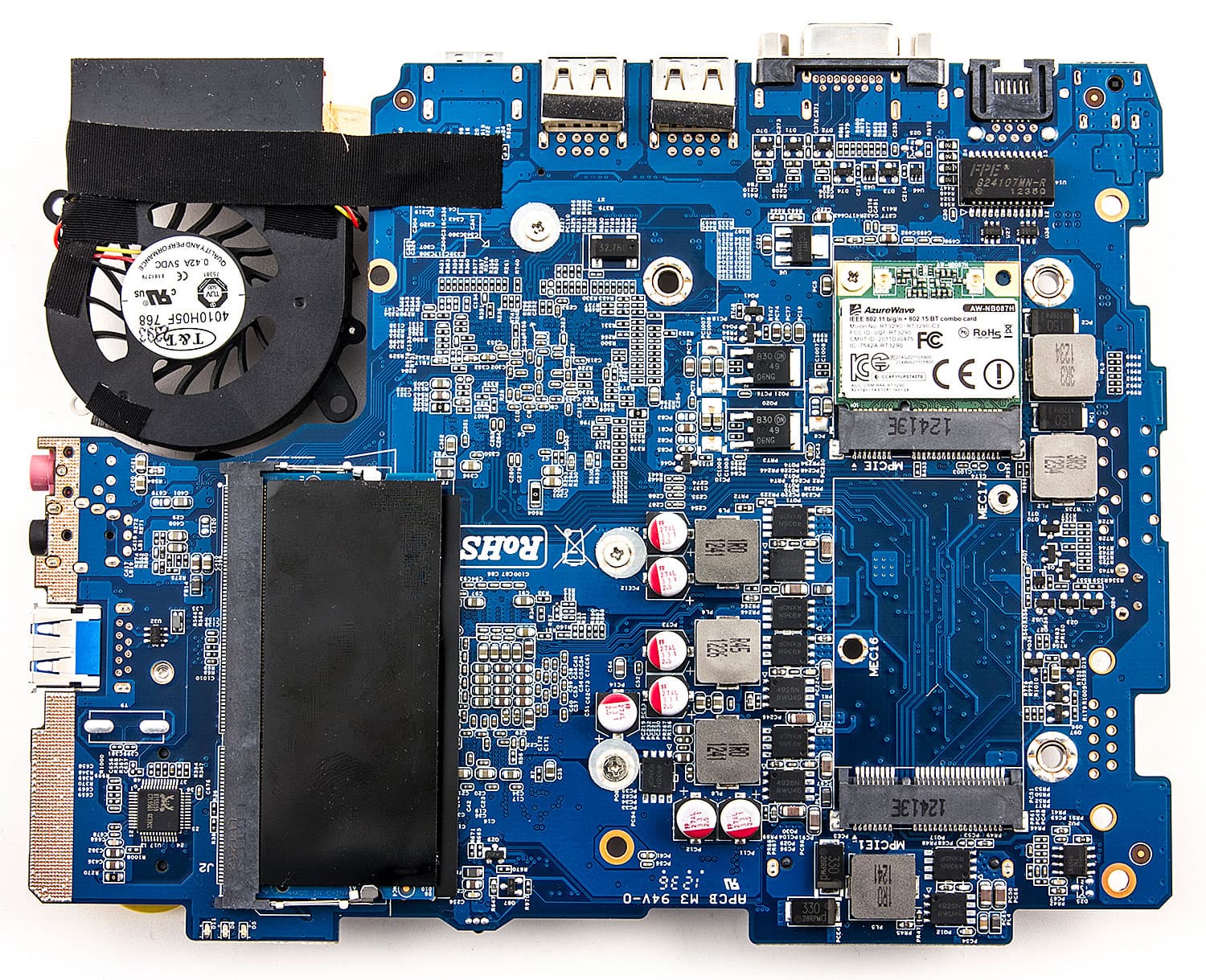 Под добротной системой охлаждения (которую мы на этот раз разбирать не стали) с тепловой трубкой скрывается «сердце» системы: Core i5-3317U и мобильный чипсет Intel HM76. Заметим, что, как и все прочие решения Intel седьмой серии, он поддерживает четыре порта USB 3.0, однако компании удалось вывести наружу лишь один из них. Хорошо, что удалось, но плохо, что один. Вот если бы систему разрабатывали с нуля, то, возможно, удалось бы при таких размерах платы вывести хотя бы пару USB 3.0 на заднюю грань (задача это, вообще говоря, менее тривиальная, чем разводить 2.0, поскольку на каждый порт требуется вдвое больше линий, да и сила тока допустима более высокая, что тоже нужно учитывать), но… Это если разрабатывать с нуля, чего, как уже было сказано выше, не делалось.