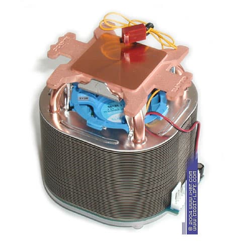Бесспорно, главнейшей достопримечательностью PCU21-VG является весьма занимательная комбинация двух технологических изысков — тепловых трубок и центробежного вентилятора. Вообще говоря, история применения и первого, и второго изысков в системах охлаждения ПК насчитывает уже много лет. Но такая идеология, по типу «бури в стакане», где ответственную роль «бури» исполняет центробежный вентилятор, а в качестве «стакана» выступает секция пластин, закрепленных на теплоотдающей части трубок, не встречалась еще нигде! Вдвойне интересно, что эта идеология, помимо привлекательной новизны (последняя, кстати, далеко не всегда дает осязаемый результат), несет в себе также и глубокий технический смысл. А именно — позволяет устранить сразу два взаимосвязанных недостатка, свойственных типическим конфигурациям на базе тепловых трубок, коими являются крупные габариты и не особенно высокая тепловая эффективность.