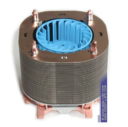 Возможно, это прозвучит высокопарно, но наш подопечный PCU21-VG относится как раз к тому крайне малочисленному классу систем охлаждения, представители которого сходу (и очень цепко) приковывают взор. Здесь есть на что взглянуть и чему подивиться! Новаторская конструкция радиатора, составленного из четырех медных тепловых трубок диаметра 6 мм и секции алюминиевых теплорассеивающих пластин толщиной 0,4 мм (в количестве 43 штук!), а также внушительный центробежный вентилятор типоразмера 80х60 мм не могут оставить равнодушными даже заядлых скептиков!