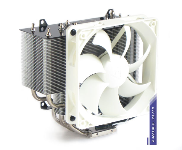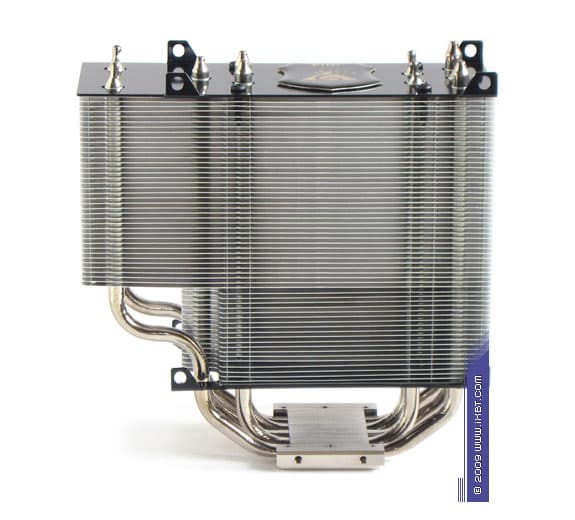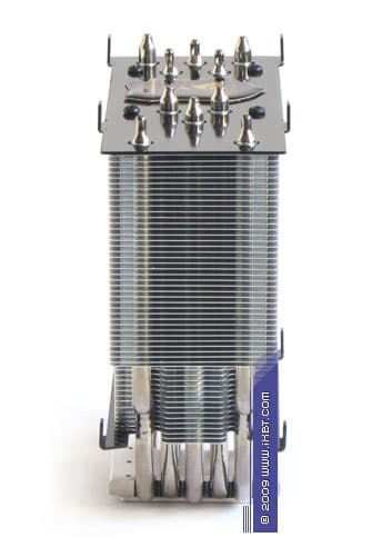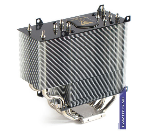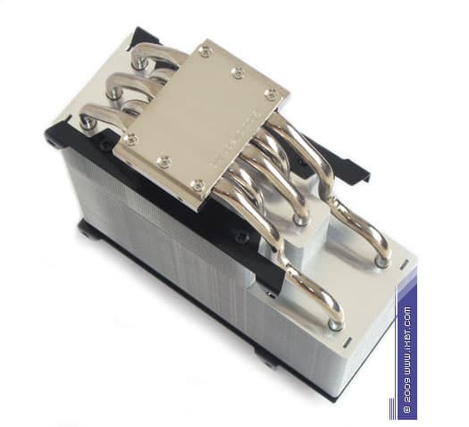 Конструктивные особенности (радиатор). «Рабочее тело» кулера образовано комбинацией медно-алюминиевого теплосъемника 38х57х8 мм, 5 медных тепловых трубок диаметра 6 мм и секции алюминиевого оребрения (2 группы пластин, 20 пластин в «нижней» группе и 39 в «верхней» группе, общая площадь поверхности теплообмена порядка 7500 см2).