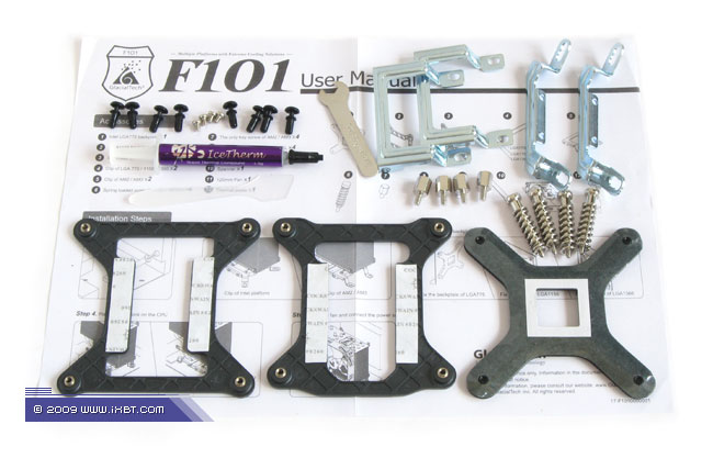 Эксплуатационная эргономика. В отличие от многих других продуктов родственного класса, F101 оснащен практичным и удобным инсталляционным комплексом. Так, установка радиатора в системах Intel (LGA775, LGA1366 и LGA1156) осуществляется с помощью специализированного винтового крепежа (набор универсальных монтажных скоб, подпружиненных винтов и соответствующих пластин-супинаторов), который довольно прост в обращении и не требует от пользователя долгих манипуляций, обычно свойственных крупногабаритным хай-эндовым кулерам. На поверку, некоторые сложности могут возникнуть только в системах AMD, где установочные процедуры включают демонтаж стандартной рамки сокета и подкручивание винтов комплектным ключом. Но в любом случае, эти трудозатраты с лихвой компенсируют два очевидных достоинства штатного крепежа — очень плотный прижим теплосъемника к процессору (с улучшенным термоконтактом) и «железобетонная» надежность фиксации радиатора на материнской плате.