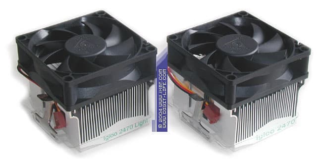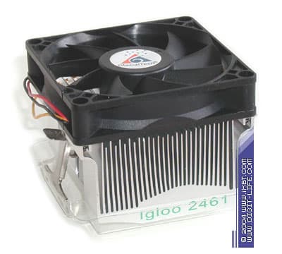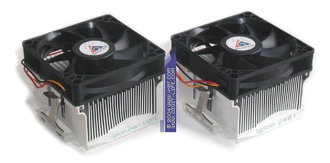 Очень неплохо смотрятся эти модели и в части эксплуатационно-технической эргономики. Несмотря на свои, в общем-то, немаленькие габариты, Igloo 2461 и 2461 Light демонстрируют вполне комфортный вес (около 290 г) и успешно коррелируют со всеми нормативными требованиями AMD, выдвигаемыми к системам охлаждения для Socket A. Хорошим дополнением к дружелюбным массогабаритным характеристикам этих кулеров становятся продуманный и удобный крепеж вкупе с предустановленной термопастой, которые призваны максимально упростить процесс инсталляции. И действительно, установка Igloo 2461 и 2461 Light проходит гладко и без затей практически на любой материнской плате с Socket A, отнимая даже у не слишком опытного пользователя всего несколько секунд драгоценного времени. Не лишним будет отметить здесь еще и весьма приличное качество набортных вентиляторов — Everflow R128018DL и R128018DM (установлены на Igloo 2461 Light и Igloo 2461, скорость вращения крыльчатки 1900 и 2400 об/мин соответственно), проявляющих добротную электрику и механику.