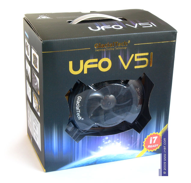 Как и подобает продукту высокого класса, UFO V51 поставляется в большой аккуратной упаковке, снабженной красочным описанием внутреннего содержимого — с листингом конструктивных «фич» и технических характеристик, а также подборкой информативных фотографий. Сквозь декоративное «окошко» проглядывает и сам кулер, облаченный в пластиковый блистер.